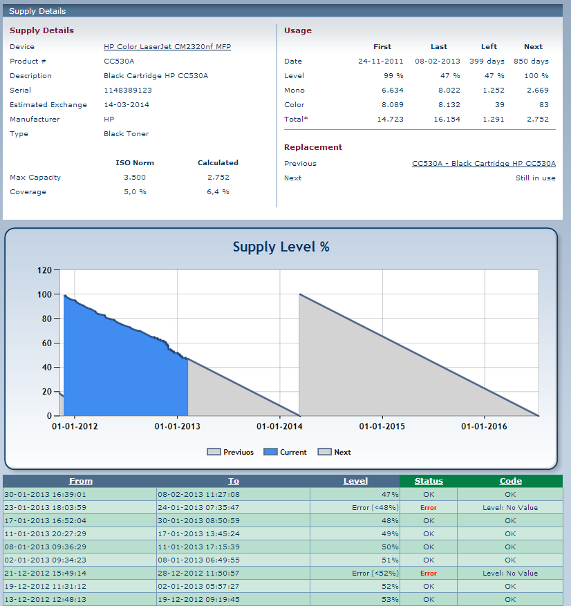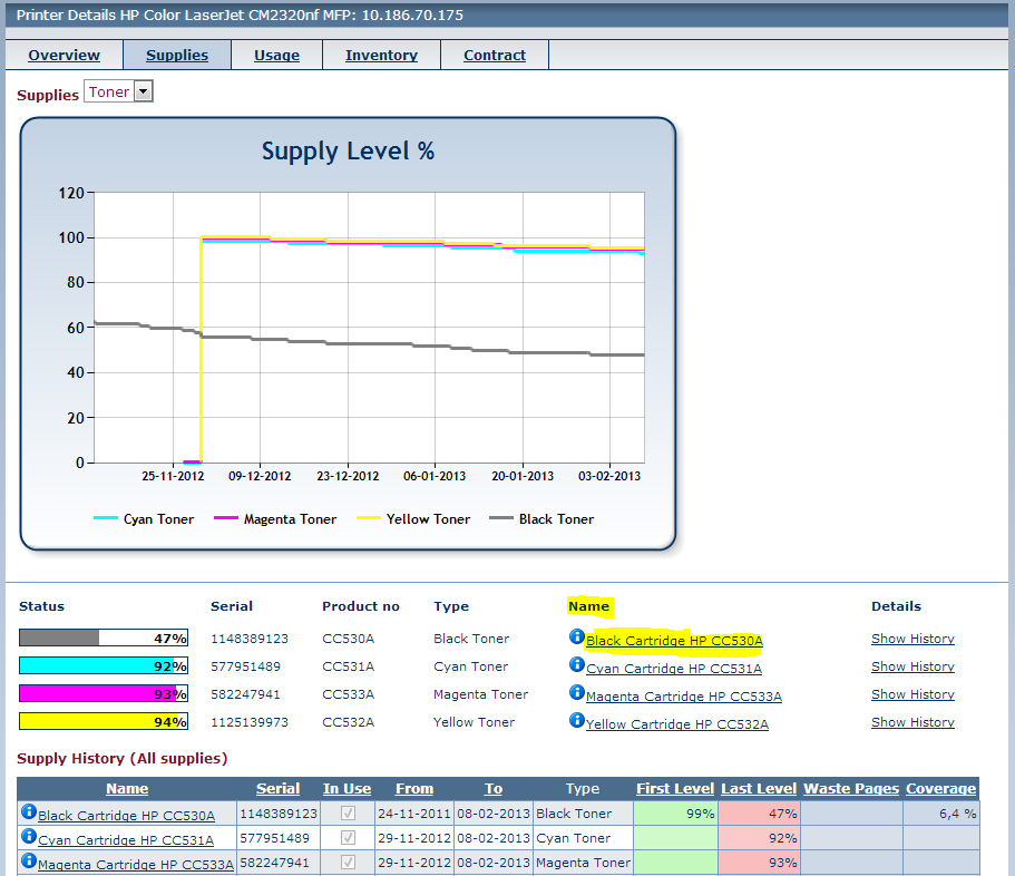 From here, you can see the supplies currently installed in the top and middle sections of the page, with the top providing a visual graph of the supplies used in the period.