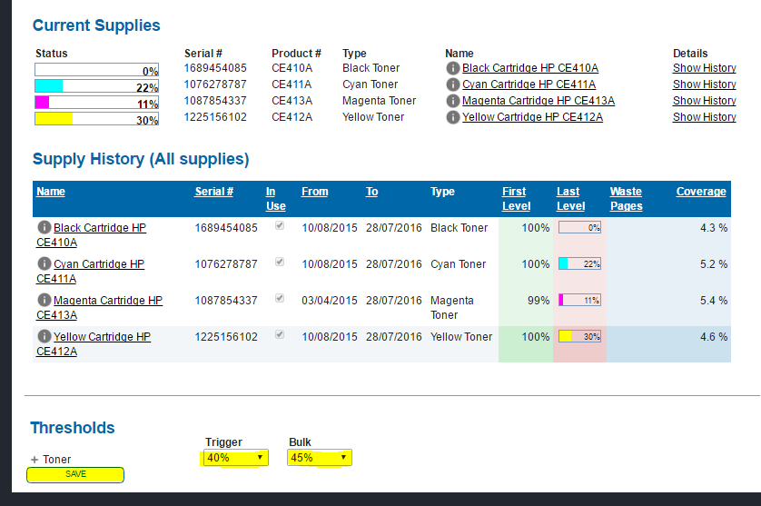 Modify a specific device, Change the thresholds on the Device details > Supplies tab in the bottom of the page when in the device you need higher threshold settings for.