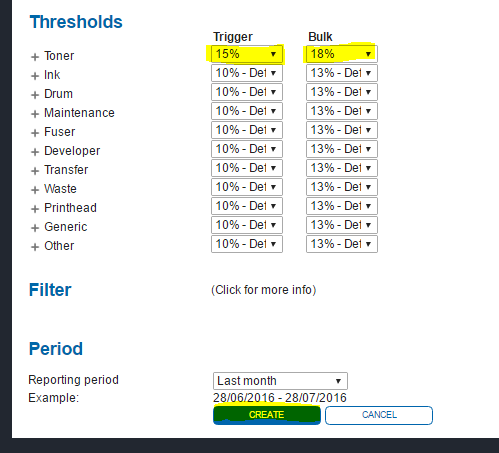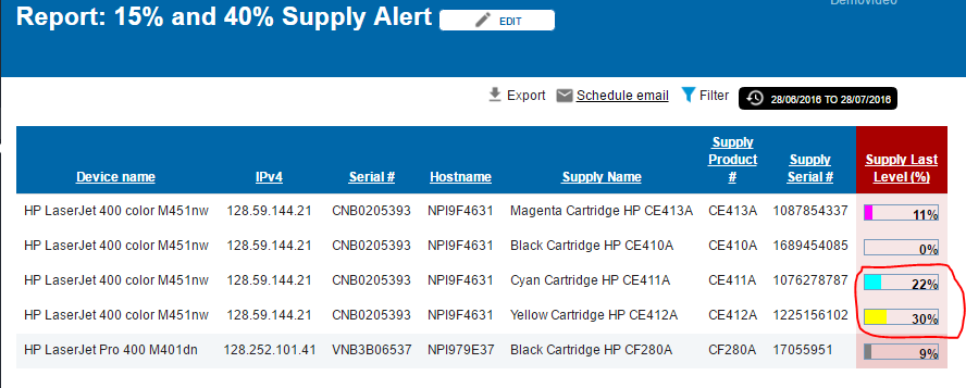 Example: Set a Supply Alert report for 15% but yet define one device to be 40%