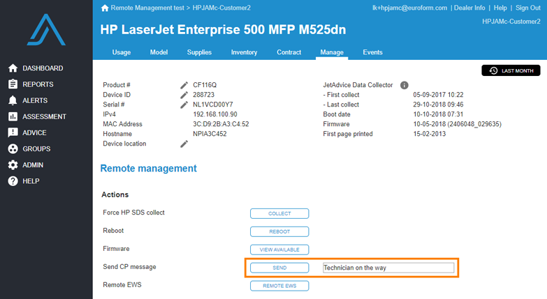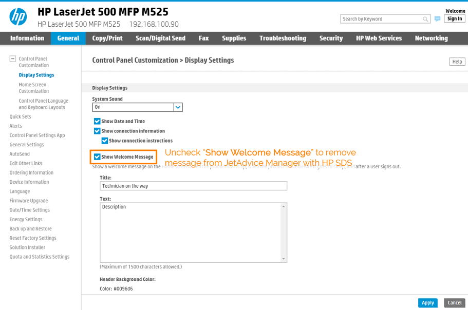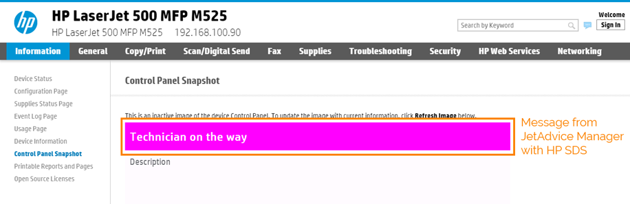 In JetAdvice Manager with HP SDS, users can help customers know what to expect for a device by remotely sending a Control Panel message to the printer.