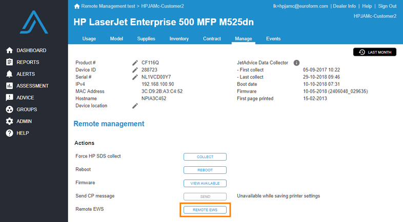 From the Manage Tab of the device, you can press the Remote EWS button to gain access ot the printer settings