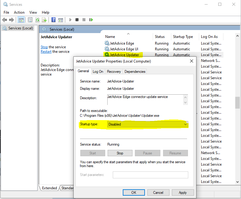 JetAdvice Edge will be looking for the specific service name to run the service. If it is not there or is renamed, it will not be able to be ran.