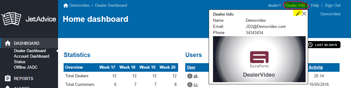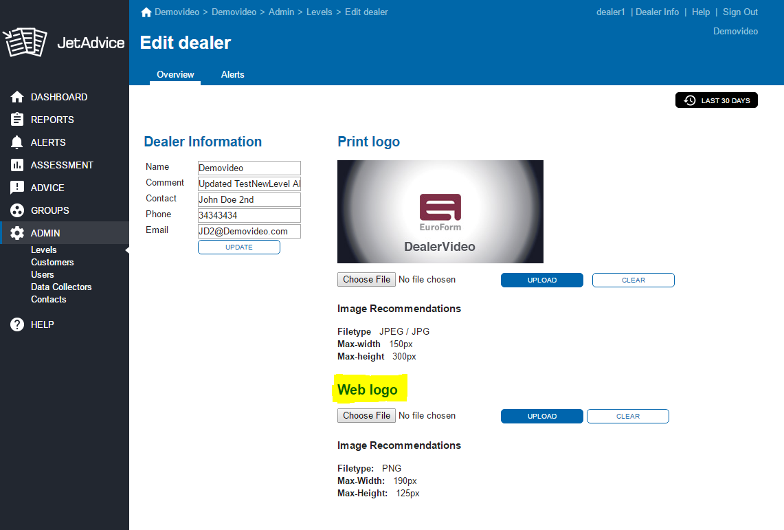 Under the Dealer settings a Web logo can now be added which will replace the standard JetAdvice logo. Once changed, it will display for the standard image all of your customers below the dealer account.